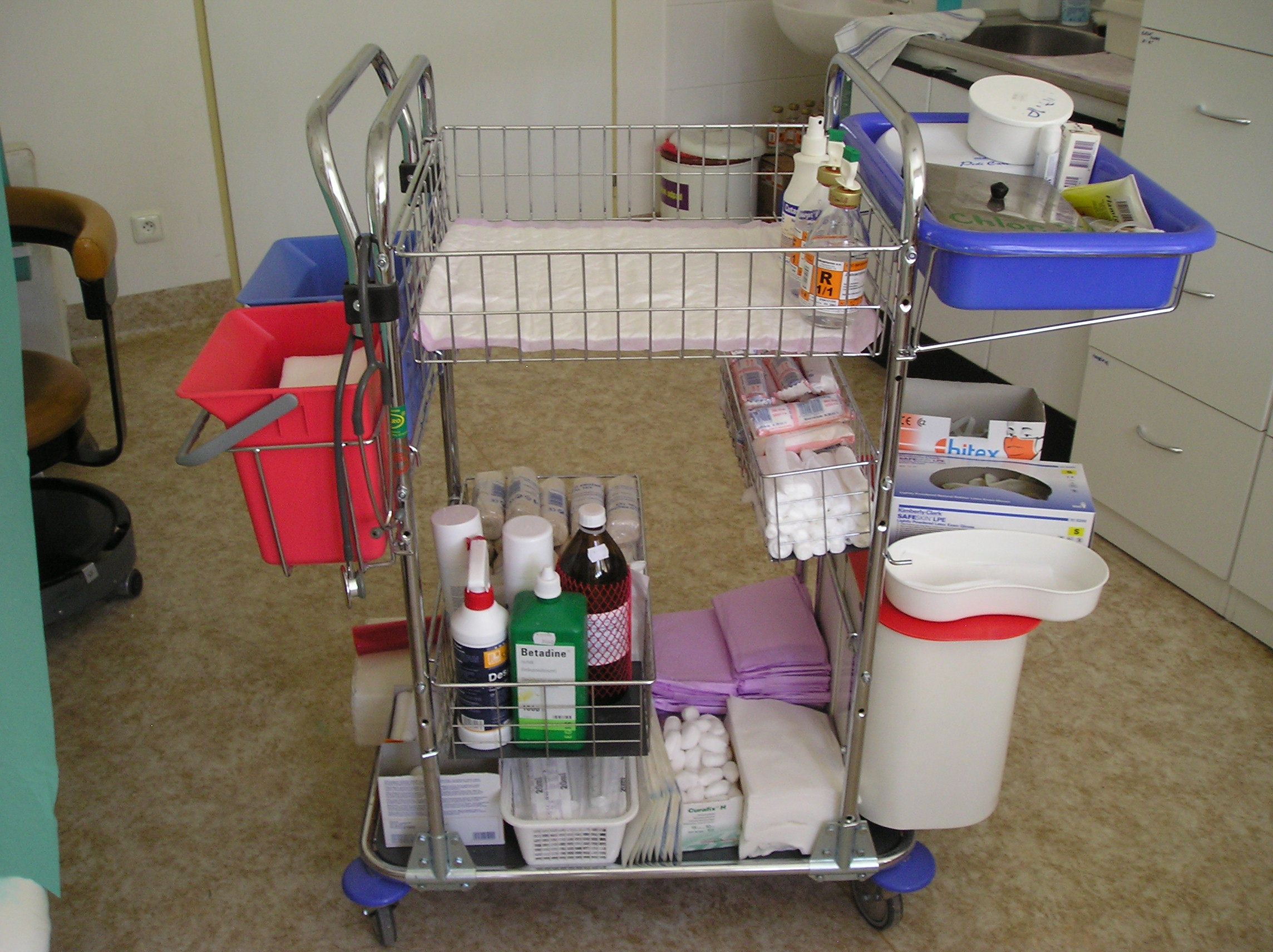 2. Pomůcky: nesterilní rukavice, ústenka, gumová zástěra, převazové nůžky, fyziologický roztok k oplachu rány, roztok k obkladu rány, sterilní chirurgická pinzeta, sterilní chirurgické nůžky, sterilní chirurgická lžička, sterilní mulové čtverce, násadka, sterilní čepelka, stěrovka s půdou, hydrofilní obinadlo, krytí vlhkého hojení, elastické obinadlo, náplast, nádoba na naložení nástrojů, odpadový pytel na infekční materiál, nádoba na ostré předměty.